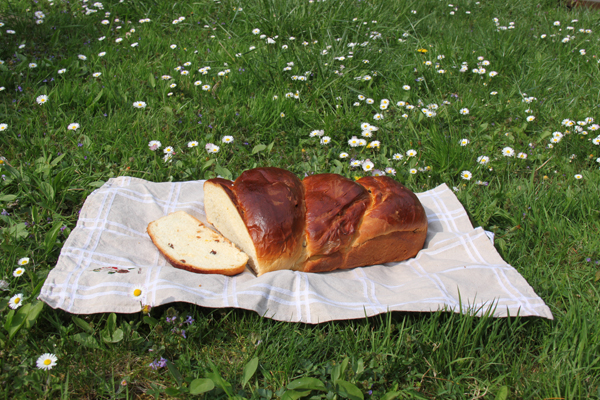 50 deka finomlisztet mikróban meglangyosítunk, 2 deka élesztőt 1 dl langyos tejben felfuttatunk. A liszthez csipet sót, egy (körömkefével jól lemosott) citrom héját, az élesztőt, egy tojást és egy sárgáját, és kb. másfél deci meleg tejben elkevert 6 evőkanál cukrot adunk. jól összegyúrjuk, amíg sima lesz. Apránként hozzáadunk 5 deka olvasztott margarint és 5 deka mazsolát, liszttel megszórva meleg helyen duplájára kelesztjük. Két ágba fonjuk, a tepsiben újra szép magasra kelesztjük. Erős lángon (180 fok) kezdjük sütni, és 150 fokra visszavesszük, mikor a teteje pirulni kezd. Kb. 50 perc alatt megsül.