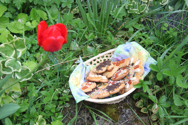 Lisztezett deszkán 3 mm vastagra nyújtjuk, formákat szúrunk ki belőle, felvert tojással megkenjük. Díszíthetjük sütés előtt (dió, mandula, mazsola, kókusz stb) vagy fél tojásfehérjét 5 deka cukorral habosra keverve utána. Sütőpapírral bélelt tepsiben 220 fokon 4-5 perc alatt megsül, sokáig puha és finom marad.